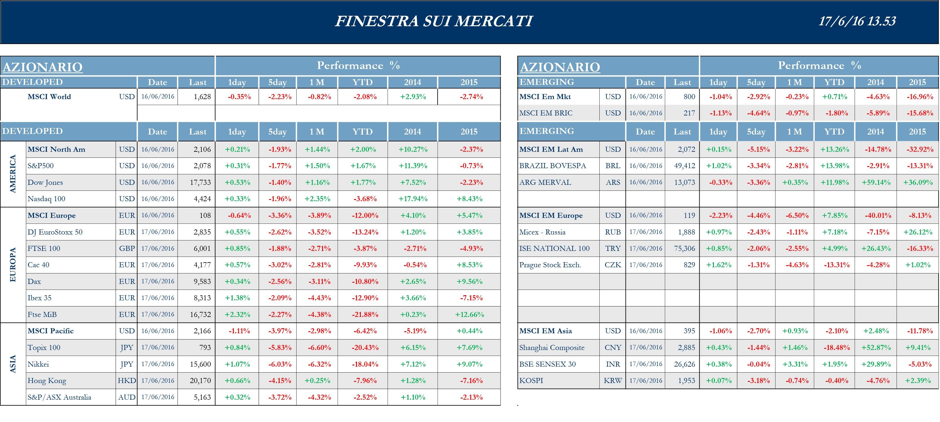 Settimana negativa per le borse a livello globale, con elevatissima volatilità delle quotazioni, con l’Europa che sconta il clima di incertezza legato all’approssimarsi del referendum sulla Brexit del prossimo 23 giugno. I timori di un’uscita dall’UE del Regno Unito ( i sondaggi sembrano confermare che i due fronti sono quantomeno testa a testa) si traducono in un generale clima di avversione al rischio che sostiene i beni rifugio, deprime i mercati azionari e ha portato sotto la soglia psicologica dello zero il rendimento del bund decennale per la prima volta nella storia. Due i verdetti delle Banche Centrali nei giorni scorsi: da una parte la Fed ha lasciato inalterati i tassi di interesse, pur ribadendo di aspettarsi due ritocchi verso l’alto del costo del denaro per il 2016. In un clima di cautela che risulta “appropriato”, tra indicatori economici contrastati, sono state tuttavia limate le stime di crescita del Pil statunitense per il 2016 e il 2017: secondo le proiezioni, la crescita Usa dovrebbe attestarsi al 2% nel 2016 e nel 2017, a fronte rispettivamente di precedenti stime a +2.2% e +2.1%, indicando che probabilmente il Comitato sarà meno aggressivo nella stretta monetaria dopo la fine di quest’anno. Anche l’Istituto Centrale nipponico ha terminato riunione di politica monetaria, mantenendo stabile la posizione sui tassi e le proiezioni ottimistiche sull’economia, nonostante la forza dello Yen e i recenti cali dell’azionario.