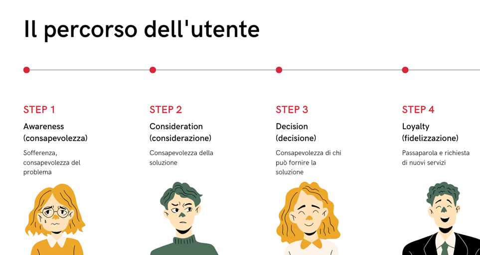 Il vero punto non è cosa usiamo, ma cosa vive e attraversa il nostro potenziale cliente. Ogni persona si trova in una fase diversa del suo percorso: chi non ha ancora messo a fuoco un problema, chi lo ha individuato ma non conosce le soluzioni, chi sta già valutando alternative.