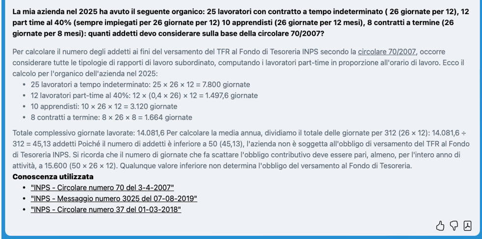 Proviamo ora, sempre all’interno di Esperto AI Lavoro, ad avere il calcolo puntuale sulla base delle regole contenute nella circolare INPS n. 70/2007: