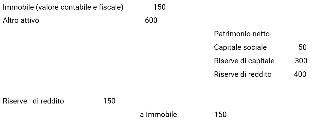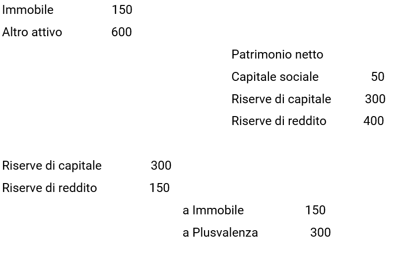 Solo se a storno della eccedenza di valore dell’immobile (300) si scomputano dal patrimonio netto riserve di reddito, non si avrà alcuna trasformazione qualitativa delle medesime, mentre se per tale storno ragionieristico vengono usate riserve di capitale (magari per mancata capienza delle riserve di reddito), esse si convertono in riserve di reddito, con più gravose conseguenze impositive rispetto a quelle previste a regime per le riserve di capitale.