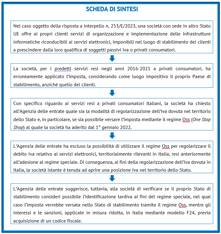 di Marco PeiroloCon la risposta a interpello n. 253/E/2023, l’Agenzia delle entrate ha fornito chiarimenti in merito alle modalità di regolarizzazione applicabili in capo al soggetto passivo stabilito in altro Stato UE che abbia reso prestazioni di servizi elettronici a privati consumatori italiani omettendo il versamento della relativa Iva in Italia.