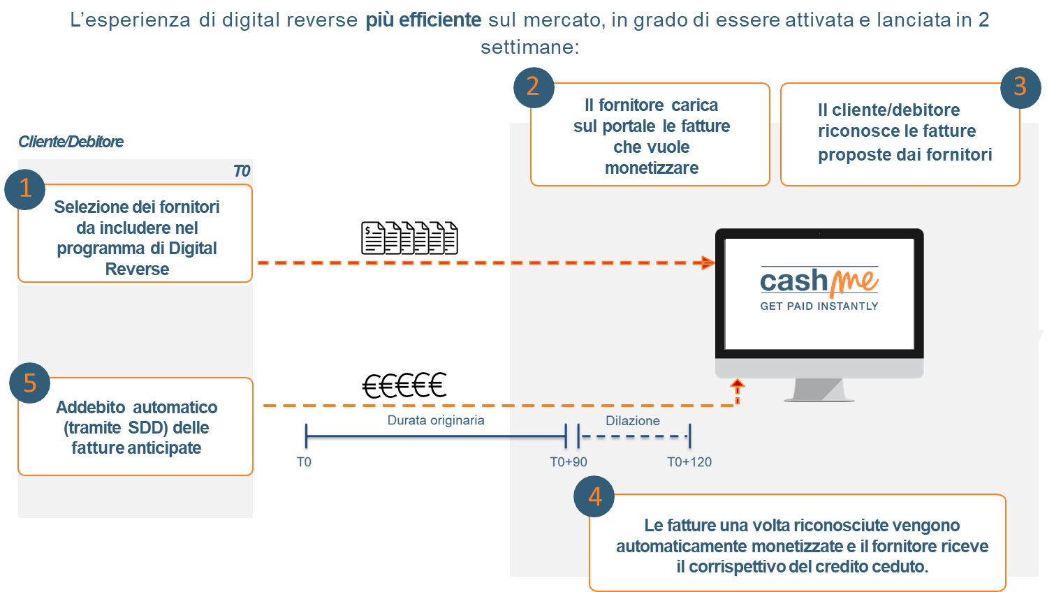 Nel 2019 però parallelamente alla piattaforma di invoice trading, nasce e si sviluppa CashMe Digital Reverse, la nuova piattaforma di reverse digitale, offerta alle medie/grandi imprese che vogliono supportare la filiera beneficiando al contempo di numerosi vantaggi: