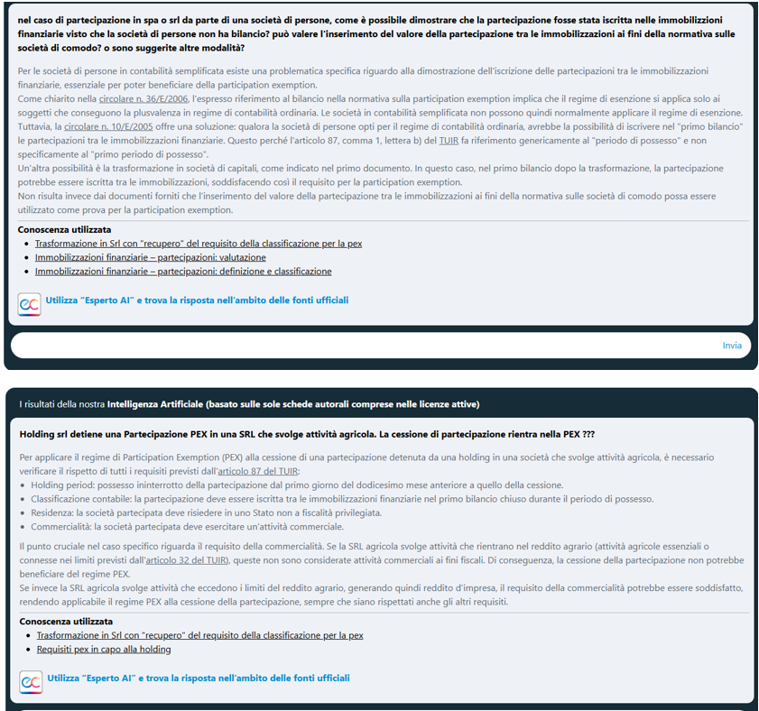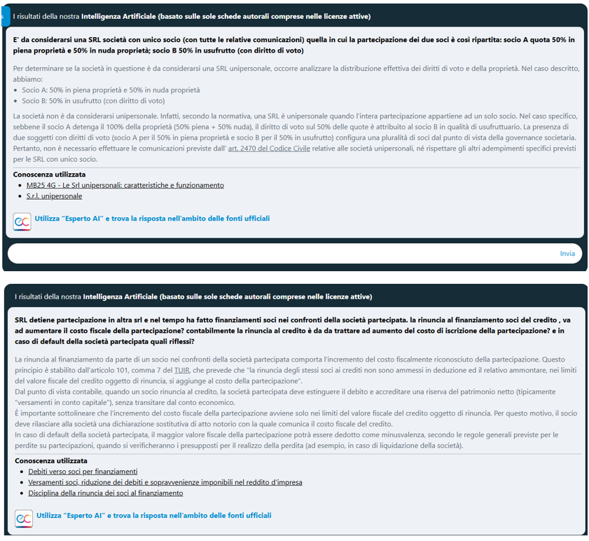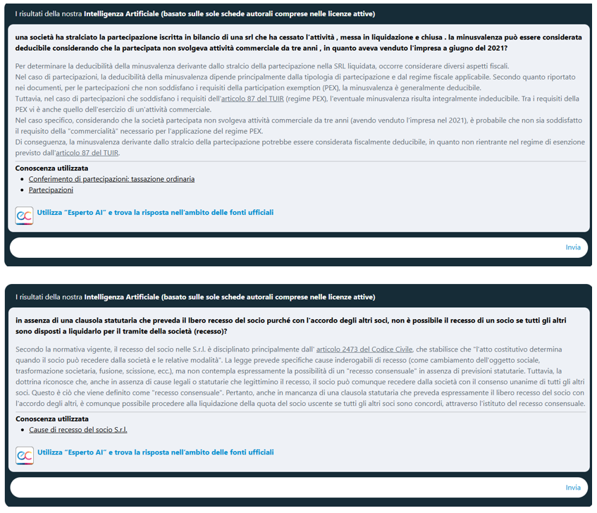 Abbiamo interrogato il nostro sistema di intelligenza artificiale, ponendo alcuni dei quesiti formulati in diretta dai partecipanti, utilizzando anche la nuova funzionalità “Esperto AI e trova la risposta nell’ambito delle fonti ufficiali”, a cui è possibile accedere cliccando in calce alla chatbot, al fine di allargare il perimetro della conoscenza utilizzata per la risposta ai quesiti, oltre ai contenuti delle schede autorali (curate dai professionisti del Centro Studi Euroconference), anche ai documenti di prassi Agenzia delle entrate e alle sentenze della Giurisprudenza di legittimità.