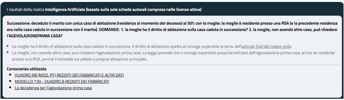 - consente di approfondire e/o verificare la risposta ottenuta, cliccando sulle fonti di conoscenza utilizzate indicate in calce alla risposta, al fine di accedere alle schede autorali che sono state esaminate da AI per rispondere al quesito che gli è stato formulato.