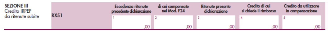 - nella sezione III del quadro RX, rigo RX51, si dà conto dell’ammontare totale delle ritenute ricevute in restituzione e del loro utilizzo ai fini della compensazione o del rimborso.